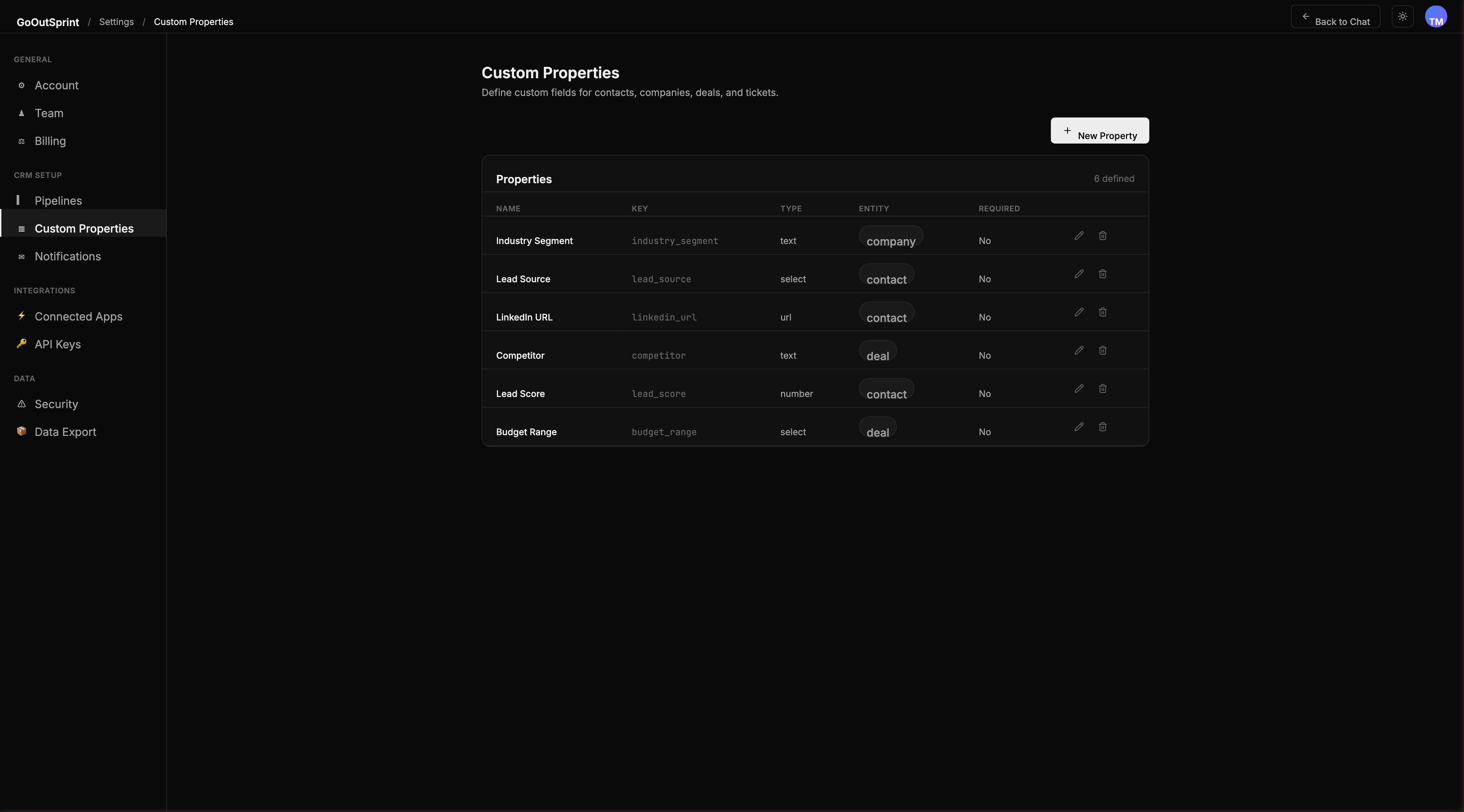 Extend your CRM data model by adding custom fields to contacts, companies, deals, and tickets. Custom properties appear in forms, chat responses, and table views.