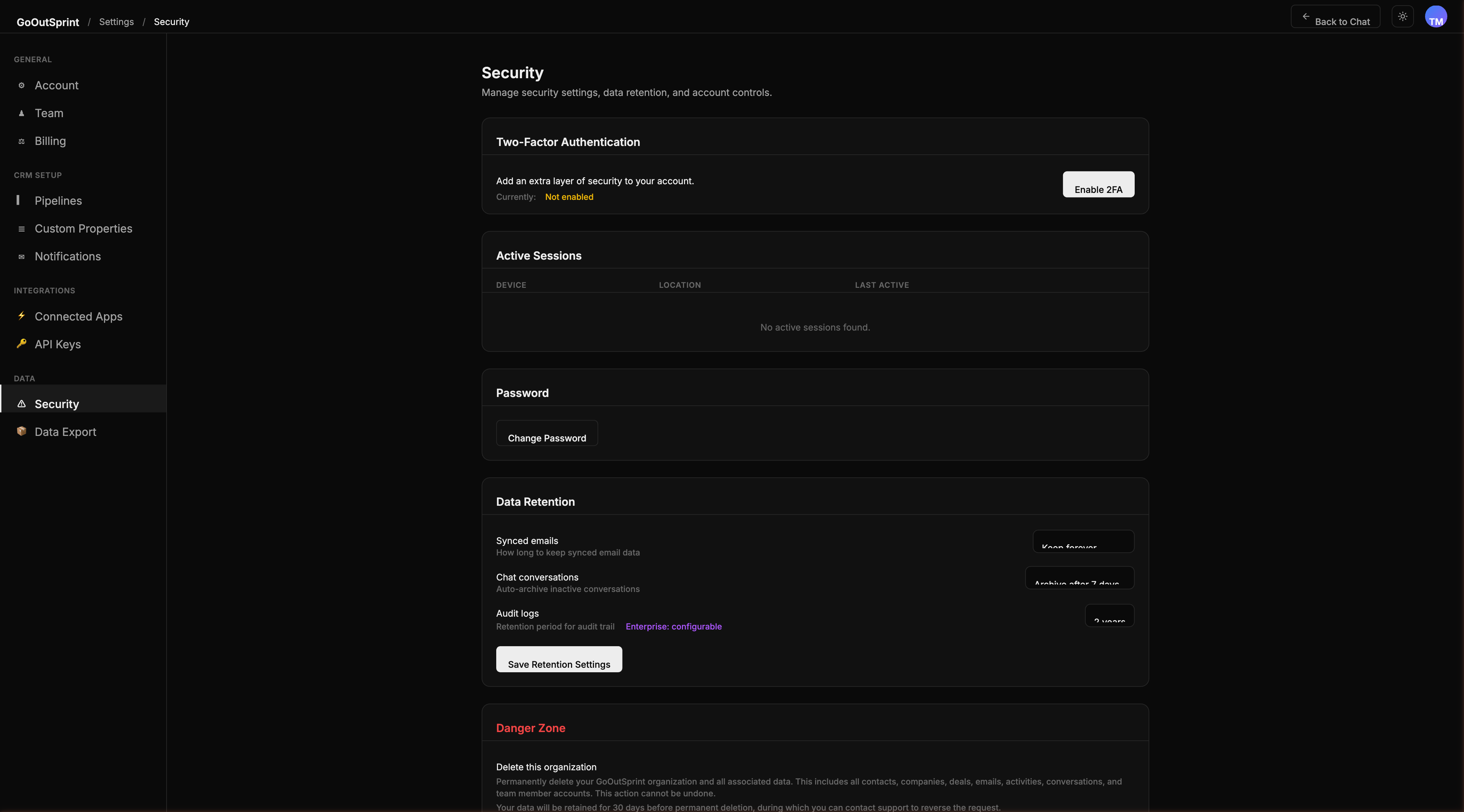 Add an extra layer of security to your team's accounts by enabling two-factor authentication (2FA). Outsprint supports authenticator apps (TOTP) and SMS as a fallback.